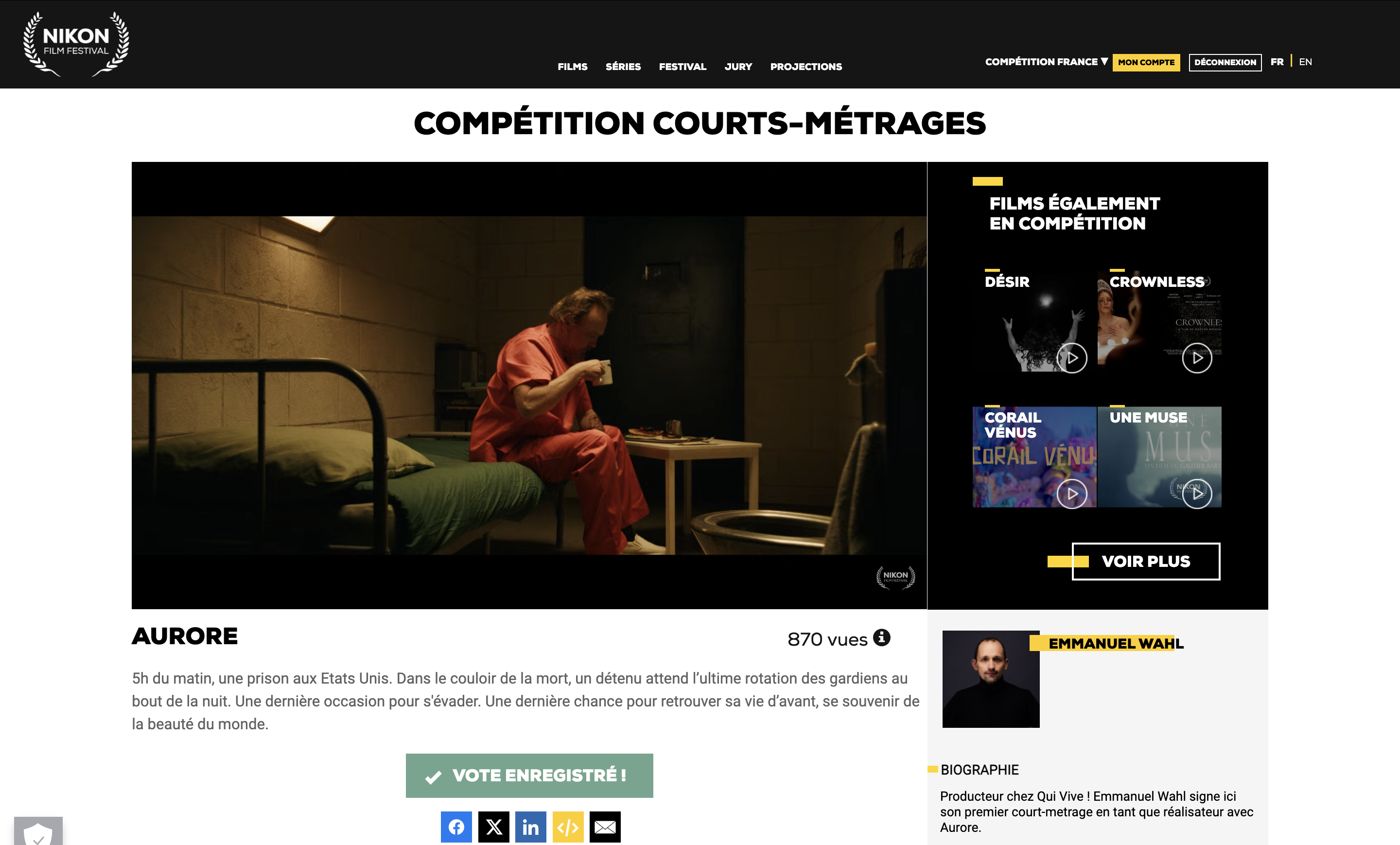 Aurore, premier court-métrrage réalisé par Emmanuel Wahl est disponible sur la plateforme du Nikon Film festival.
